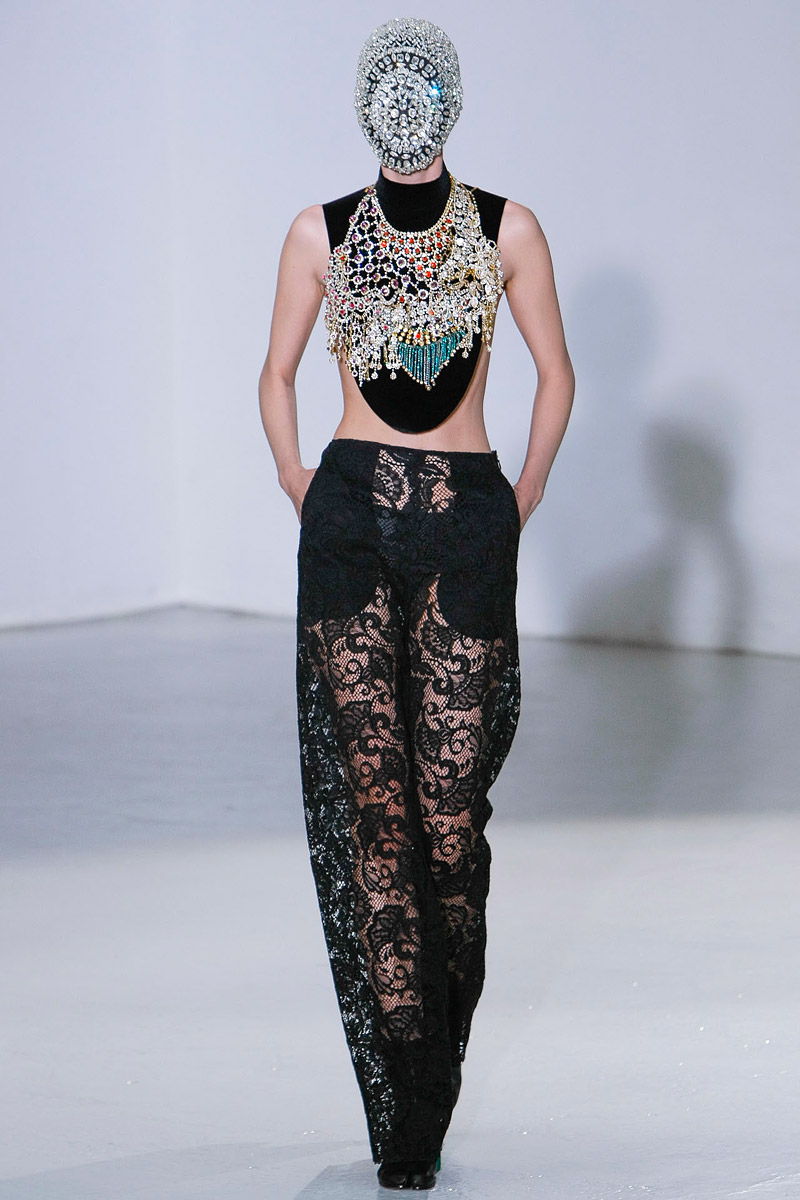 The models went incognito behind masks (another old Margiela trope) embroidered with hundreds of crystals. There was no shortage of beads or lace either, but nonetheless the presentation acted as an avant-garde (and eco-friendlier) antidote to the shows that preceded it this week.Giambattista Valli by Hamish Bowles on vogue.com